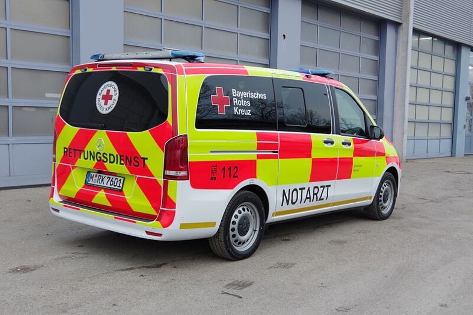Der von Ambulanz Mobile ausgebaut Mercedes-Benz Vito 119 CDI mit Allradantrieb und 9-Gang-Automatikgetriebe wurde vom Bayerischen Roten Kreuz gemeinsam mit den anderen Durchführenden im Rettungsdienst Bayern und den Herstellern von Basisfahrzeug, Ausbau und Signalanlage gemeinsam abgenommen und vorgestellt.
