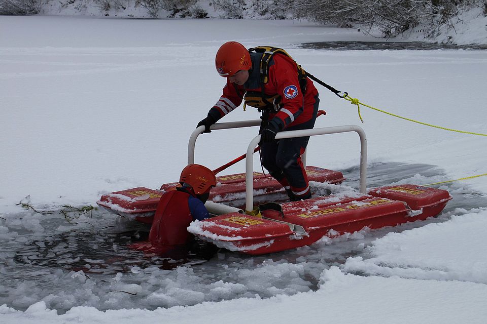 Ist eine Person eingebrochen, sollte unverzüglich Hilfe unter Notruf 112 verständigt werden. Auch die Wasserwacht Bayern ist dann mit Schnelleinsatzgruppen, Eisrettungsschlitten und Rettungstaucher*innen zur Stelle.