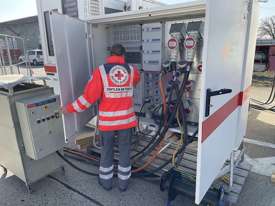 Neben dem Zeltbau ist gerade die Infrastruktur Wasser/Abwasser und Strom ein wichtiger Bestandteil in dieser Zeltstadt. Die völlig autarke Stromversorgung wird von zwei 300 kVA Ersatzstromerzeugern sichergestellt. Die die Stromversorgung wurde redundant aufgebaut und könnte mit wenigen Handgriffen auf das Ersatzgerät umgeschaltet werden. Angeschlossen hieran sind zwei Großverteilerkästen, die sich bereits im Hochwassereinsatz 2021 bewährt haben, vier Baustromverteiler und sechzehn Kleinverteilkästen. Somit ist die Grundversorgung der Zeltstadt gesichert. Insgesamt wurden ca. 1.400 Meter Starkstromleitungen, über 600 Meter Verlängerungen und 400 Meter Erdungsdraht verlegt. Zu einer ordnungsgemäßen Anlage gehört auch das Messen der Verteilungen und Leitungen mit speziellen Messgeräten, das Protokolieren und Plan erstellen, wie bei einer Hausinstallation auch.